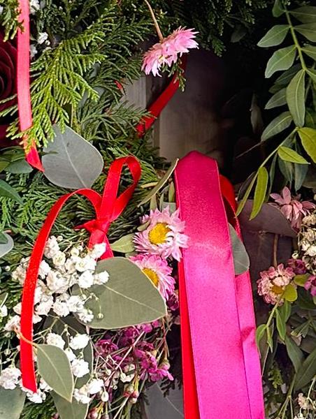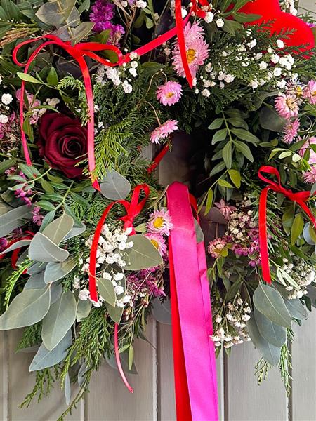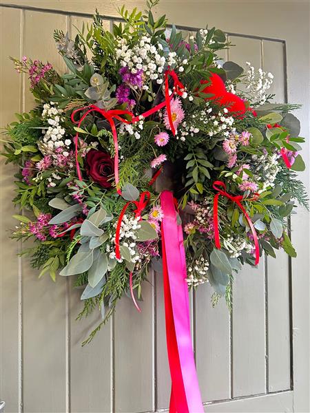 Fresh door wreath of seasonal greens with a red and pink vibe perfect for valentines and through spring
