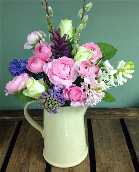 A beautiful selection of seasonal flowers presented in a country jug vase