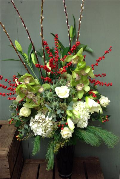 A truly magnificent display of stunning winter flowers presented in a glass vase. Orchids, lilies, roses, amaryllis, hydrangeas, berries and winter foliage are all included.
